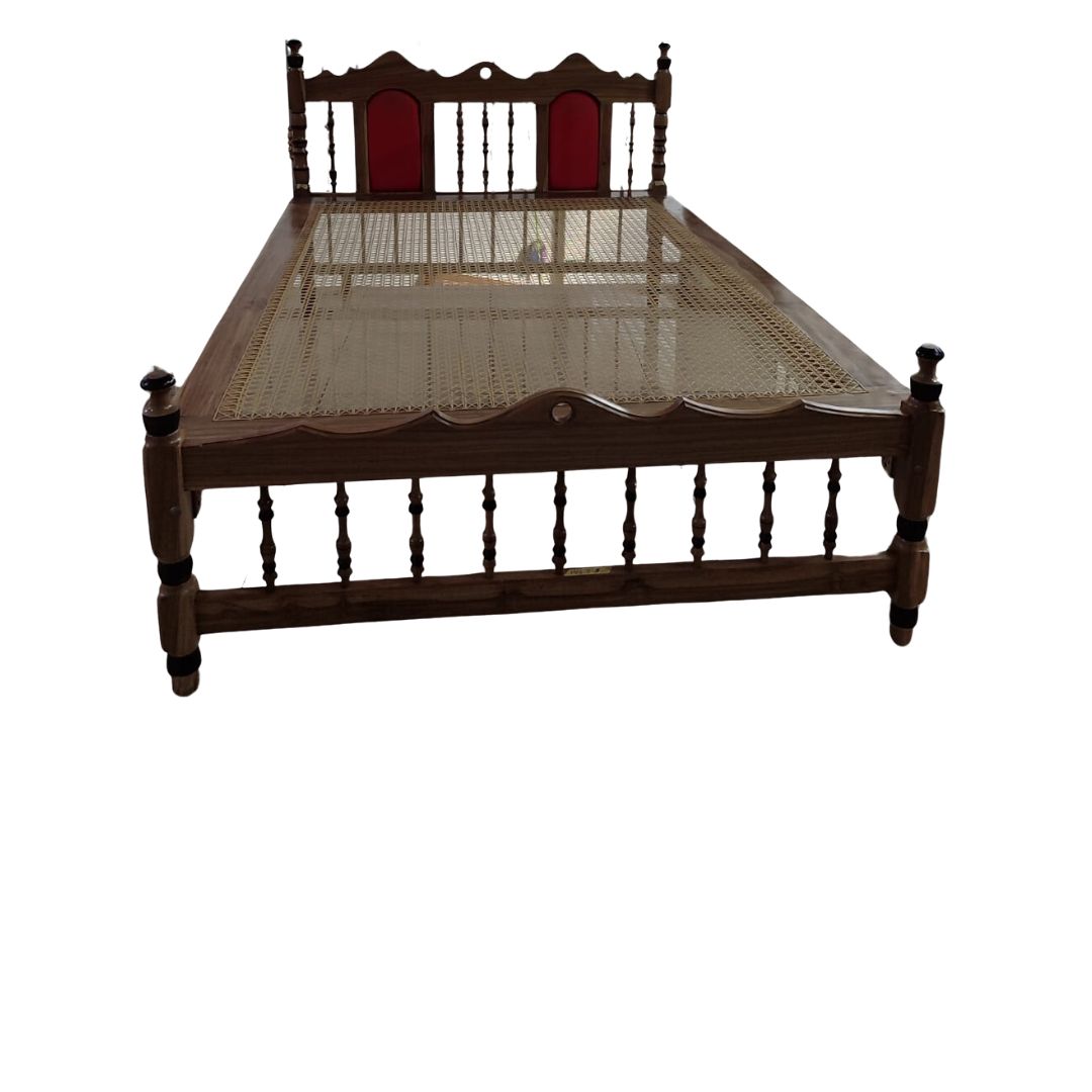 Cama de madera Mauro enjuncada con respaldo tapizado.