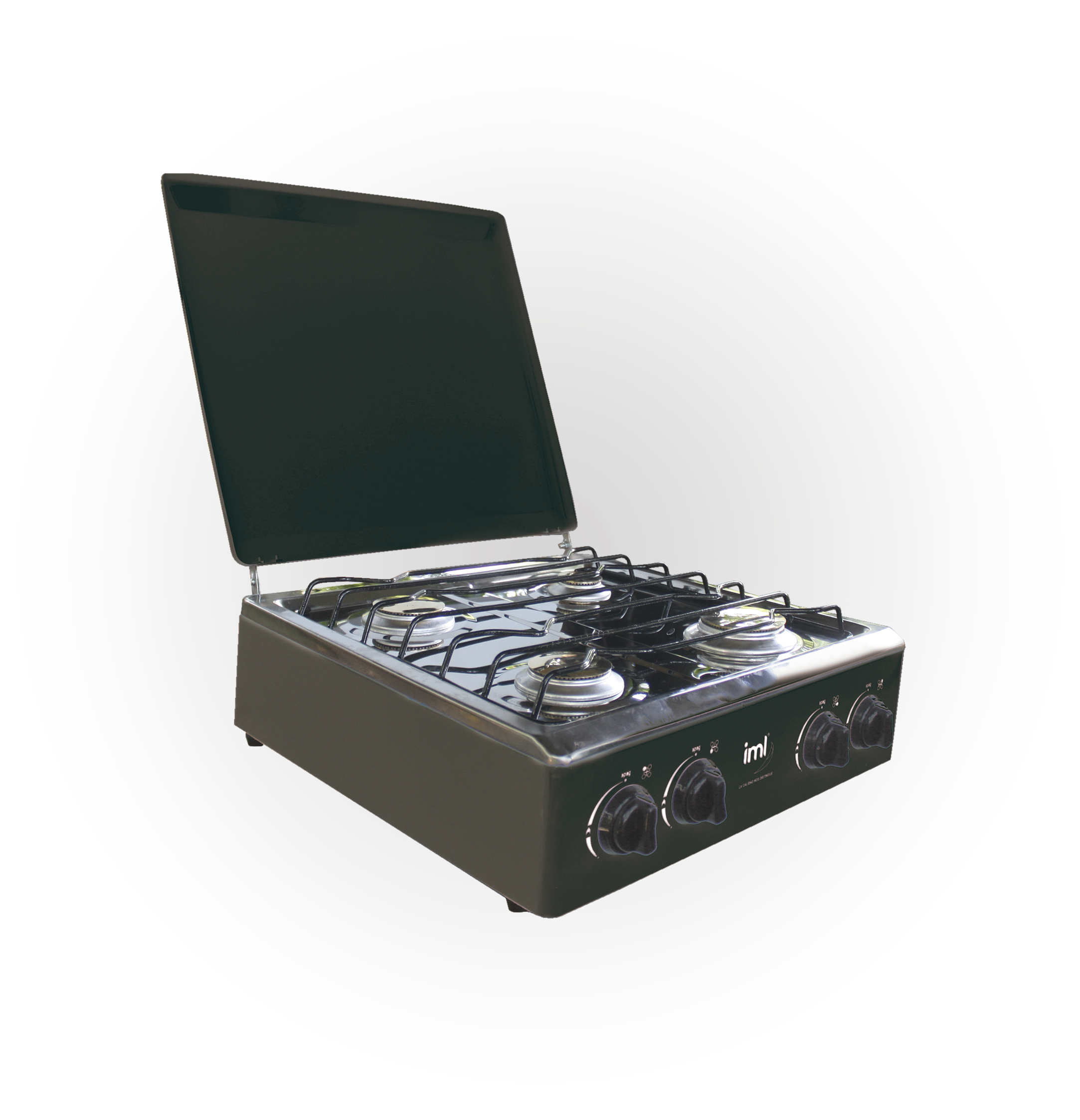 Cocina de mesa con respaldo de cuatro quemadores.